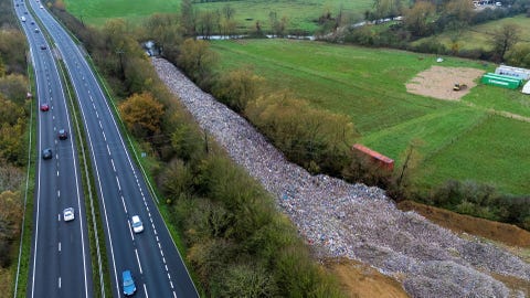 En tolv meter hög hög av skräp, bestående av strimlad plast och hushållsartiklar, har blivit ett stort problem i den brittiska byn Kidlington i Oxfordshire. Situationen har fått både miljöorganisationer och lokala politiker att reagera starkt, men myndigheternas åtgärder har hittills varit otillräckliga.