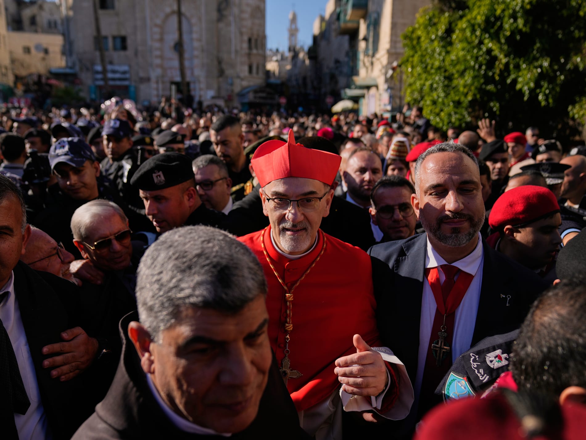 Kardinal Pierbattista Pizzaballa, högste katolske ledaren i det heliga landet, inledde årets julfirande med en traditionell procession från Jerusalem till Betlehem. Han uppmanade till en ”jul full av ljus” och försöker sprida budskap om fred.